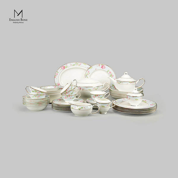 52 Pcs Dinner Set: 6 x Dinner Plate, 6 x Dessert Plate, 6 x Soup Plate, 6 x Cereal Bowl, 6 x Tea Cup, 6 x Saucer, 6 x Fruit Bowls, 3 x Large Salad Bowl, 1 x Small Platter, 1 x Large Oval Platter, 1 x Round Serving Dish, 1 x Tea Pot, 1 x Sugar Pot, 1 x Milk Pot, 1 x Big Soup Tureen